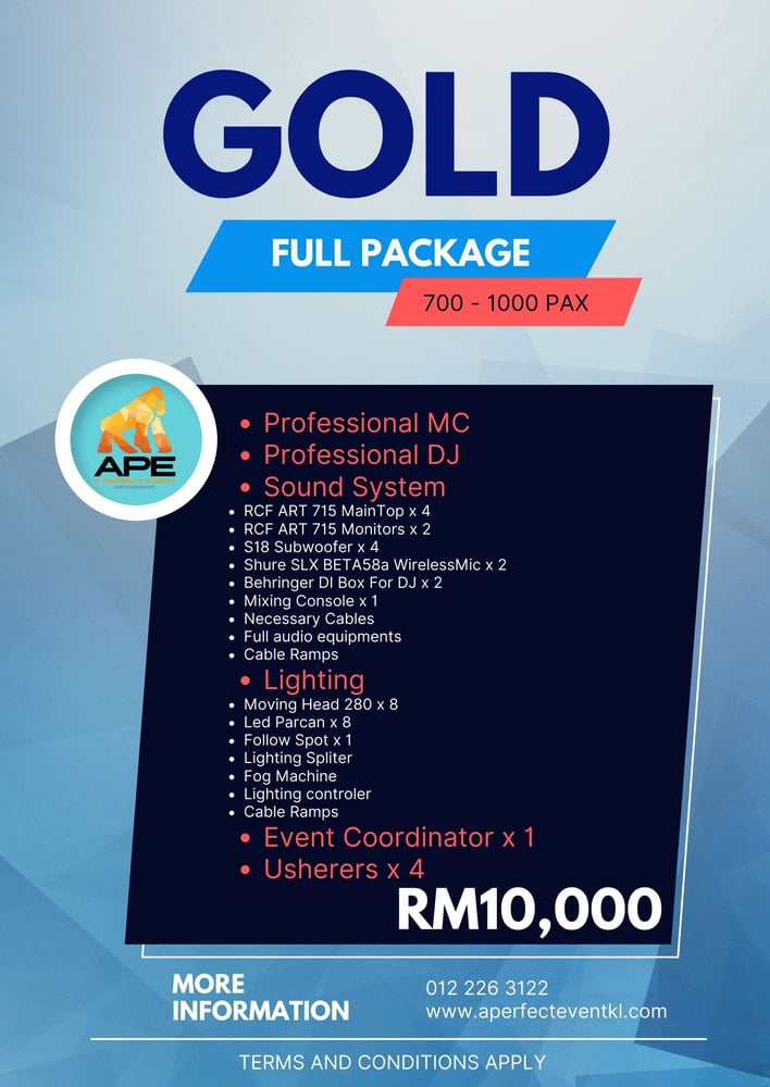 This Package give you the full service that is needed to run A Perfect Event that accommodates 700 - 1000 pax.